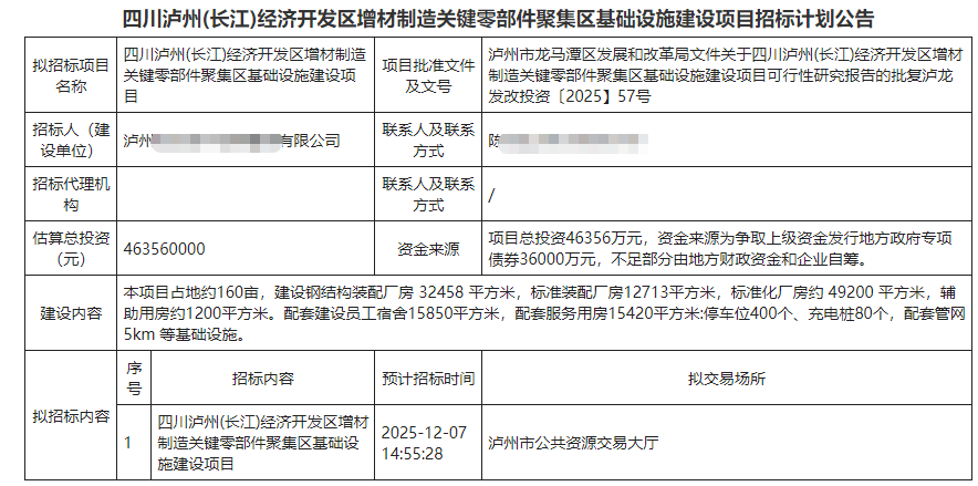 近日,四川泸州(长江)经济开发区发布公告,12月7日将对“增材制造关键零部件聚集区基础设施建设项目”公开招标,项目总投资额超4.6亿元。