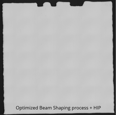经过完整的热处理后,采用光束成形工艺的激光粉末床熔融(LPBF)材料可以生成尺寸从数百微米到1毫米的晶粒,这远大于LPBF通常的晶粒尺寸。此外,还可以制备出几乎没有裂纹、成型后缺陷率低于0.04%的样品(见上图)。剩余的少量缺陷可以通过后处理热等静压(HIP)进行处理(见下图)。