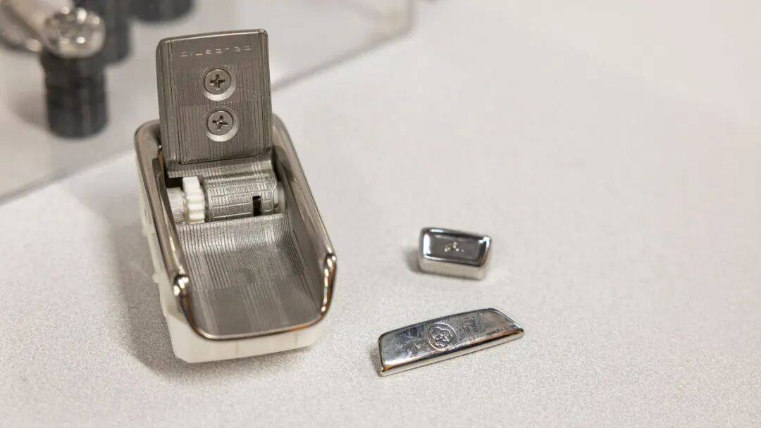 此外,设计团队在隐蔽区域也引入了高复杂度的3D打印细节。乘客座椅皮革扶手的不锈钢锚固件经镜面抛光处理,其铰链盖板在受力开启时暴露内腔,露出灵感来自凯迪拉克蒙德里安图案和装饰艺术时代的图案(如下图所示)。它采用金属粘结剂喷射技术制造。生坯打印完后放入烧结炉中烘烤20小时,最高温度接近约1377℃,这一过程会使部件收缩多达20%。