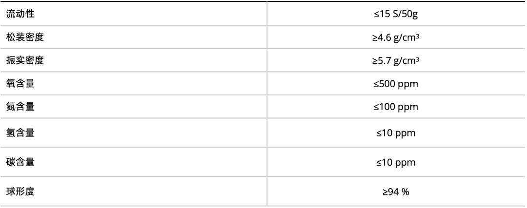 倍丰智能依托自主研发的Gas Heat Atomization(下简称GHA)设备,通过创新性的雾化工艺在高纯制备环境下,有效降低杂质含量,钨粉纯度高,杂质如氧、碳、氮及其他杂质较少,保证了产品的性能稳定。且瞬时高温制备使其几乎无空心粉、卫星粉,粉末具有较高的松装密度、振实密度及堆积密度,在打印成型过程更有利于产品的致密度,提升制件综合性能。