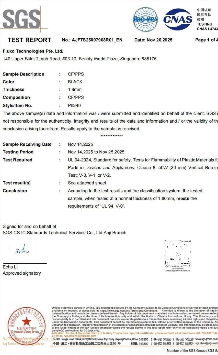 SGS测试报告显示,Rytexint™ PPS P6240在1.8mm厚度条件下表现优异,所有测试样品均达到V-0要求。测试包括两组条件:标准环境与高温老化。测试内容包括: