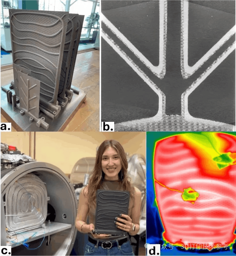 (a)增材制造的高温钛散热器原型,带有嵌入式分支热管网络(75×125 和 200×260 毫米面板);(b)散热器的 X 射线 CT 扫描,显示内部多孔芯吸层,用于被动液体循环;(c)宾夕法尼亚州立大学博士生 Tatiana El Dannaoui,在热真空测试设施中安装散热器原型,以模拟空间环境运行;(d)在真空室中运行的热管散热器的热图像