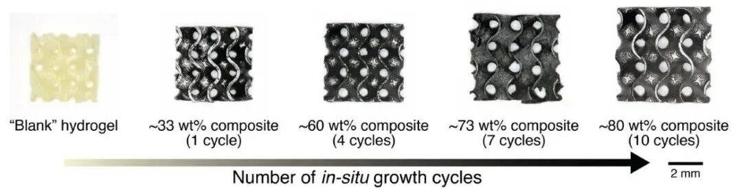 他们将浸泡过金属盐离子溶液3D打印的水凝胶支架转移到第二溶液中进行化学反应,使上一步的盐离子转化为不溶性的金属纳米颗粒,并被锚定在网络骨架上;然后反复进行上两步的溶液浸泡和化学反应,来不断提高金属的含量。