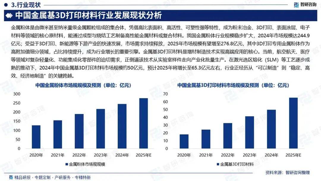 3D打印技术参考查询到,国内权威的市场调查及行业分析专家智研咨询,于近日发布了《2026-2032年中国金属基3D打印材料行业市场竞争现状及发展趋向研判报告》,其指出,2024年中国金属基3D打印材料市场规模约50亿元,预计2025年将增长至65.3亿元左右,行业正经历从“可以制造”到“稳定、高效、经济地制造”的关键跨越。推动金属3D打印粉末市场快速增长的原因既有内因更有外因。