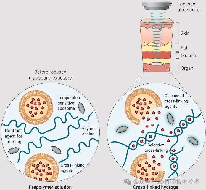 来自教授团队研发出了一款超声引导的3D打印技术平台,其借助聚焦超声以及超声响应生物墨水,可以直接在体内精准打印生物材料。这些生物墨水(也称超声墨水)融合了生物聚合物、成像造影剂与携带交联剂的温敏脂质体,能经注射或导管传送至体内深处的目标组织部位。