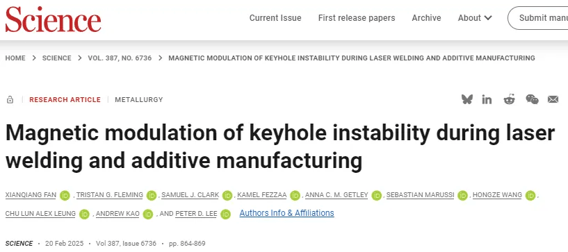 伦敦大学学院的中国学者XIANQIANG FAN等人在Science发表了题为“Magnetic modulation of keyhole instability during laser welding and additive manufacturing”的文章。
