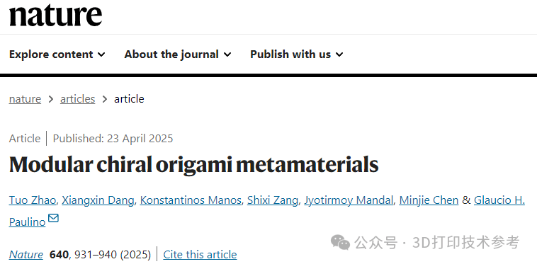 来自普林斯顿大学的赵拓等人,借助多材料3D打印技术开发出了一种具有多模态变形机制的模块化手性折纸超材料,它在力学、热学、光学等多个领域具有重要应用潜力,实现了突破性的进展。