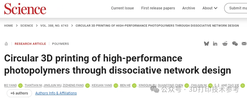来自浙江大学的谢涛教授和郑宁教授团队在science发表了题为“Circular 3D printing of high-performance photopolymers through dissociative network design”的文章。