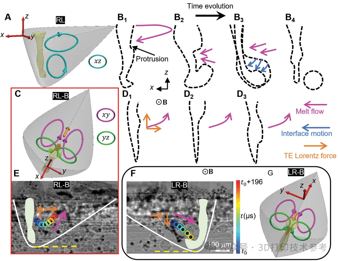 这项研究聚焦金属3D打印的机理,探索激光粉末床熔融(LPBF)过程中使用磁场来减轻钥匙孔孔隙度。通过高速同步辐射X射线成像技术,并结合横向磁场实验,揭示了匙孔不稳定性的形成机制,与此同时验证了磁场能够通过热电磁流体动力学效应调控熔池内的流动行为,从而有效抑制气孔的产生。