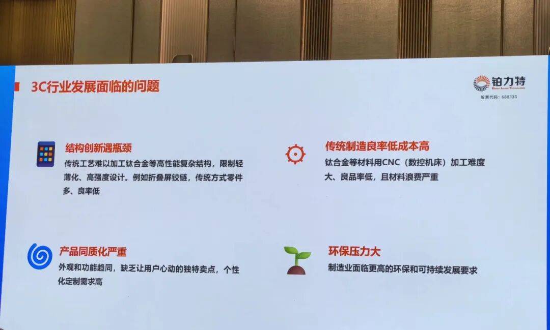 在2025年12月于雄安举办的增材制造产业年会上,铂力特副总经理杨东辉介绍了该公司在消费电子领域的应用和解决方案。铂力特作为全球行业内首家将3D打印技术批量、规模化应用于电子3C行业的企业,对应用市场及技术应用有怎样的理解呢?