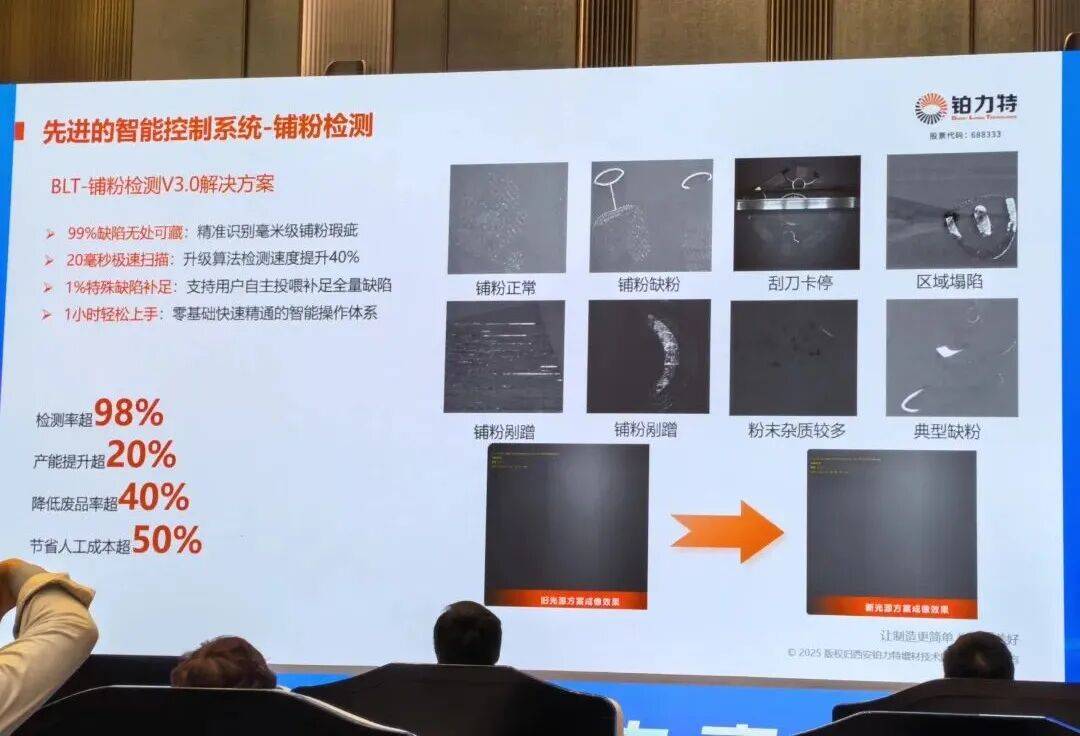 在真正打印过程中风场非常关键,要吹走大颗粒,提升表面质量,保障光学质量,实现低的氩气消耗。打印过程中有很多潜在的缺陷,要通过AI和视觉等手段识别缺陷,把潜在的缺陷处理掉,防患于未然。铂力特如今可以在20毫秒内完成极速扫描,缺陷检出率超98%,显著降低废品率,提升产能。
