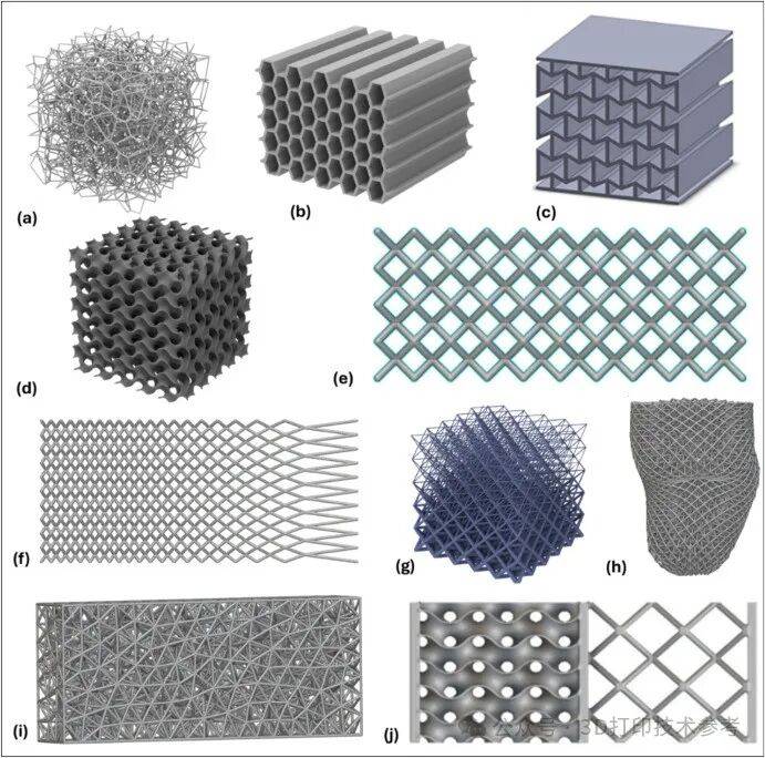 (a) 泡沫结构(b) 蜂窝结构 (c) 负泊松比结构(d) 晶格结构 (e) 周期性晶格结构(f) 按单元尺寸渐变(g) 按晶格厚度渐变(h) 共形晶格(i) 随机晶格结构(j) 混合晶格
