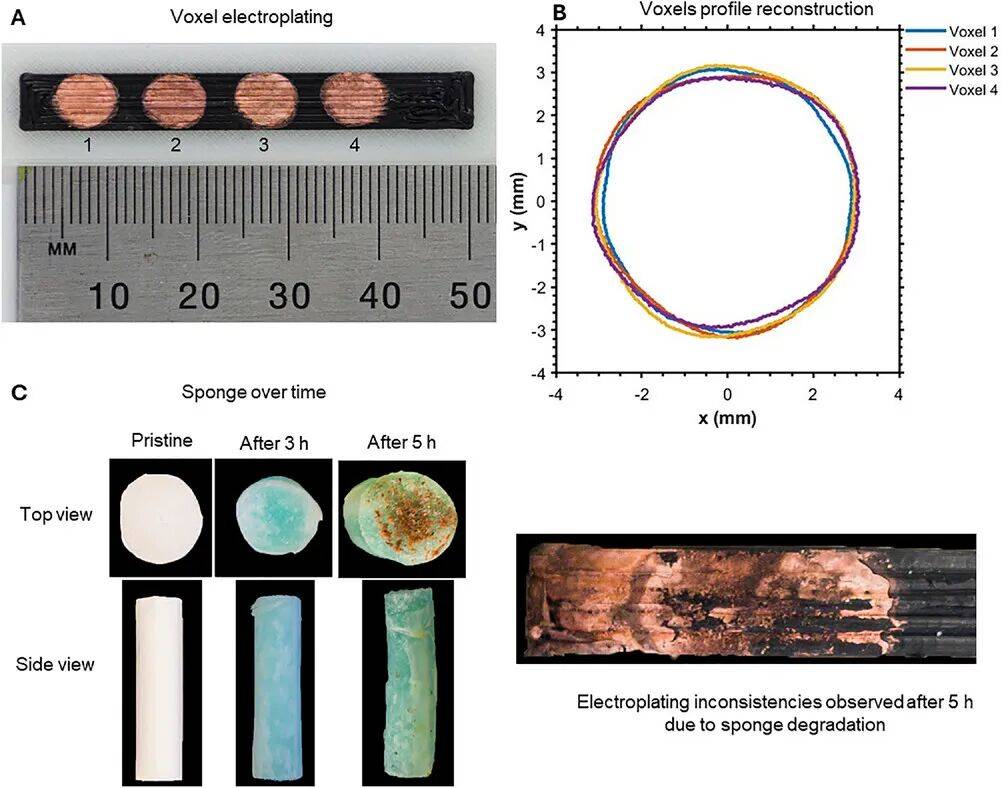 值得一提的是,与传统的槽式电镀不同,该研究提出的电镀工艺是一种局部电镀。浸有电解液的海绵每次只对一个区域进行电镀。由于海绵为直径6毫米的圆柱体,因此可电镀的最大面积为28.27平方毫米。在对第一个区域进行电镀后,电镀头移动到下一个区域(可以是x轴或y轴方向),依此类推,直至整个目标部件完成铜电镀。此外,电镀头的设计可兼容不同尺寸的海绵,因此可以轻松安装直径小至1毫米、大至10毫米的海绵。为了展示所提出方法的潜力,研究人员制作并表征了几个功能性演示样品。