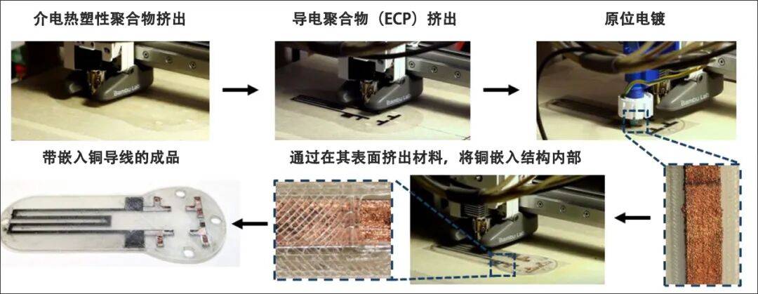 该工艺首先挤出介电热塑性聚合物(如PLA或TPU)形成结构基底。然后,将导电聚合物(如导电PLA,CPLA)沉积到该基底上。CPLA挤出后,3D打印过程暂时停止,以便使用机载电镀头对导电结构进行电镀。电镀完成后,打印恢复,并在新镀的铜层上继续沉积介电聚合物,将铜结构完全嵌入周围的聚合物基体中。