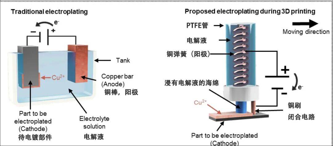 整个电镀装置经过设计,可安装在3D打印机上,从而实现打印过程中的电镀。系统由一根装有电解液和铜的聚四氟乙烯(PTFE)管组成。阳极浸入电解液中,待电镀部件则位于管外。