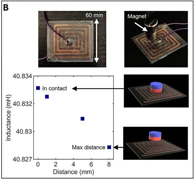 进一步的,研究人员制作了一个能够检测附近金属物体的接近传感器。该传感器由一块60mm×60mm的PLA基板(厚度0.4 mm)构成,基板上印有一个基于CPLA的平面螺旋线圈,该线圈有8匝,线圈宽度为2mm。在印刷导电图案后,在优化的条件下对螺旋线圈进行铜电镀,然后用两层额外的PLA层(总厚度0.4 mm)完全封装。测试发现,随着磁体靠近,传感器的电感逐渐增大,电感与磁体接近程度之间存在明显的正相关性。