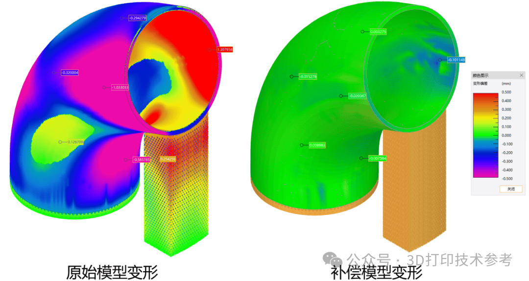 该公司在2025年公布了与蓝箭航天的合作案例,涉及一款钛合金薄壁弯管零件。该零件在打印过程中面临支撑添加量大、后续去除困难、精度差等风险。零件在打印之前进行了变形预测,显示最大变形了超过1.8mm;基于该数据,漫格使用VDE软件进行了反向补偿,二次仿真验证最大偏差低于0.2mm;实际打印后进行扫描测量,显示实际尺寸与设计尺寸偏差稳定控制在0.2mm以内。