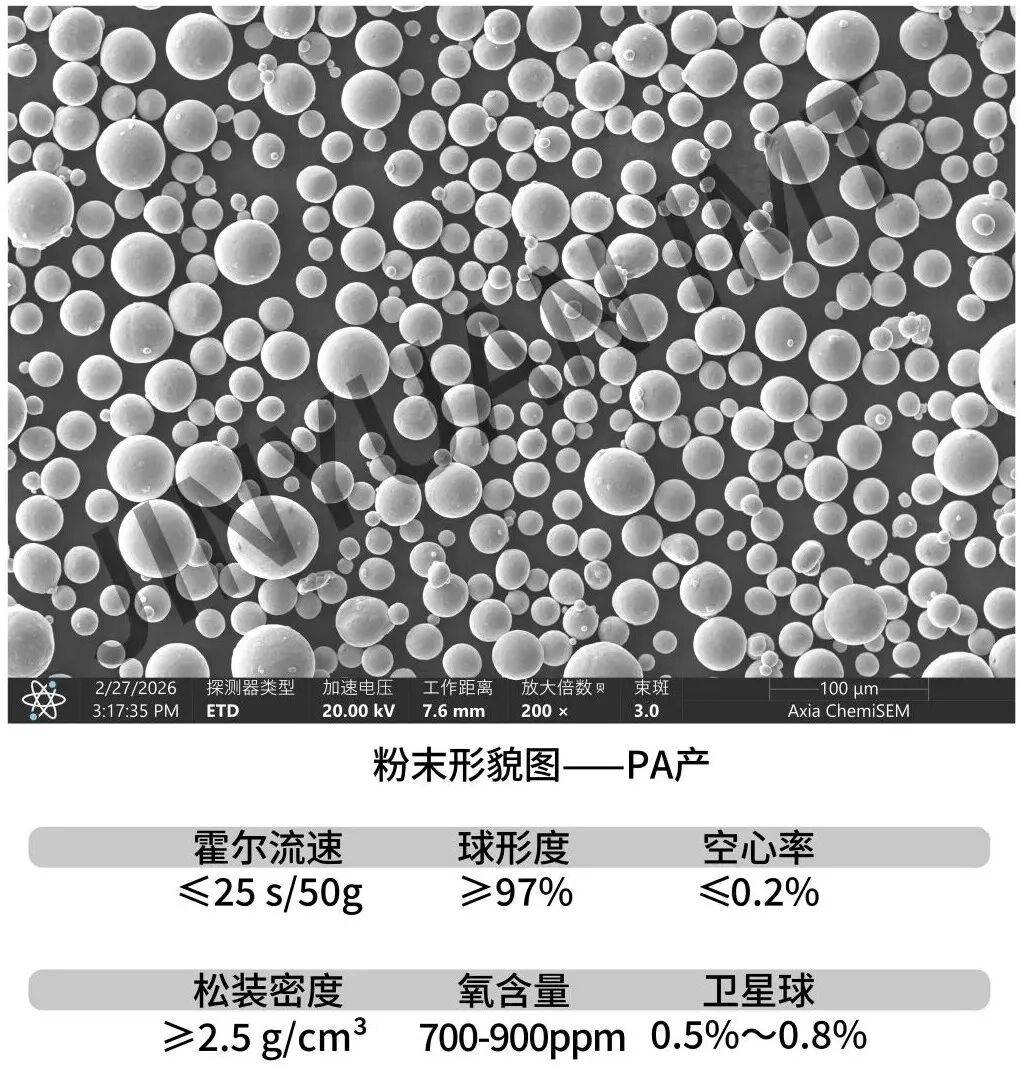 由PA技术制造的钛合金粉末全面对标国际高端品牌。金源智能表示,PA粉末空心粉率可控制在0.2%左右,卫星球占比0.8%左右,粉末的球形度、流动性等关键指标也均表现突出。此外,粉末氧含量低于900PPM,这确保了材料在循环使用中的性能稳定,可循环使用次数达15次以上。这些特性有助于减少打印件的内部缺陷,对追求良率的3C精密制造而言,具有实际价值。