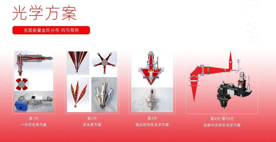 2017年研发初期,通历曾尝试多种光学方案,从同轴一分四光束方案、同轴多光束方案到锥反射环形光方案等,但效果均不理想,多个光点拼接容易形成光斑和熔池形貌不佳、加工方向仍然受限等应用缺陷,如在复杂曲面进行加工时,激光头进行偏转,激光光点难以汇聚,导致加工效果变差,多点拼接光学方案对工艺要求比较高,焦点高度敏感等问题因此用在大规模生产较为困难,加工效果亦是南辕北辙,各项成本也随之增加,为了更符合实际应用场景,通历研发出环形光斑-丝/粉光同轴光学设计方案。