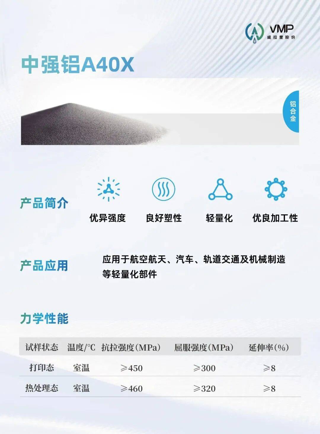 为满足航空航天、汽车制造等领域轻量化需求,威拉里凭借核心技术,成功解决了铝合金增材制造过程中易开裂、延伸率不足的行业难题,研发出高强铝C·V-A500、C·V-A600及中强铝A40X系列新品。