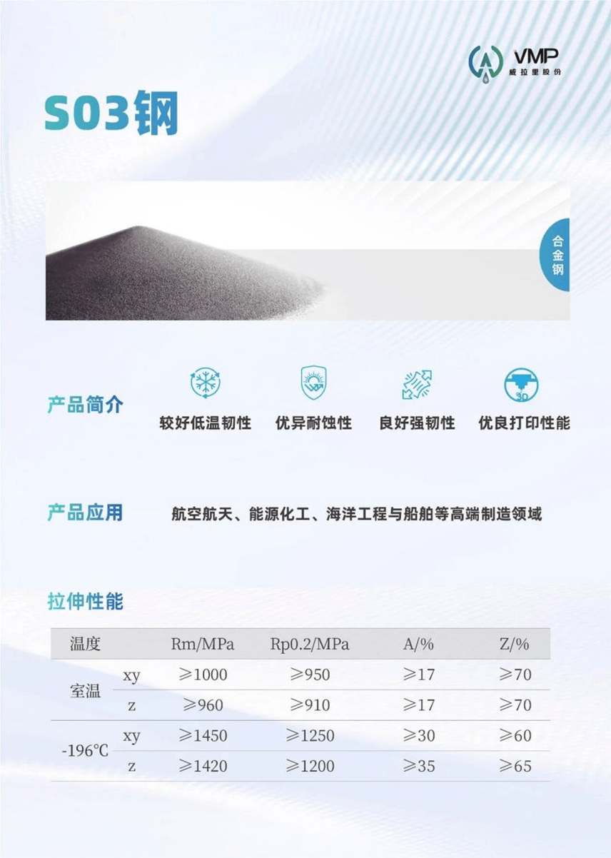 S03钢是一种超低碳合金钢粉末,兼具高强度、高韧性与优异的耐腐蚀性能,适配低温、腐蚀与高载荷工况,适用于液氧贮箱的支撑环、管路接头,液氧管路的阀门组件、连接环及发动机涡轮泵密封环等航天航天部件。除航空航天领域外,还可满足能源化工、海洋工程与船舶等高端制造领域对于复杂结构部件的制造需求。