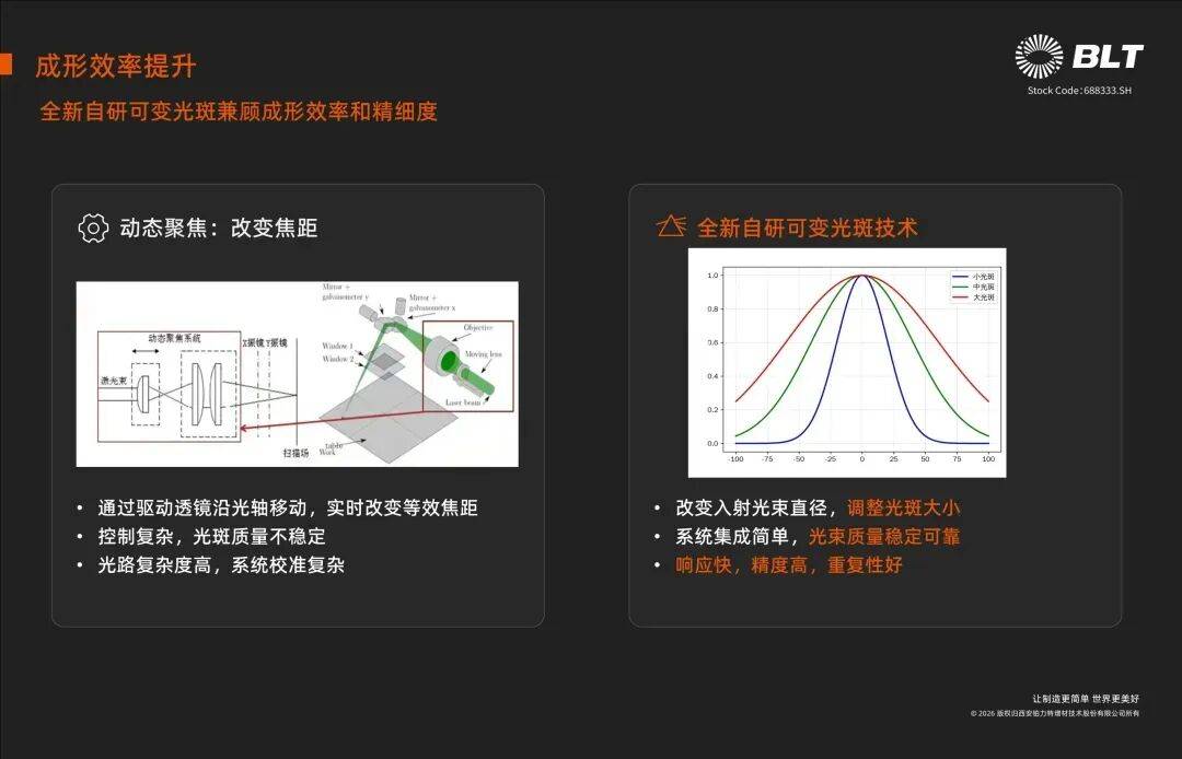 铂力特也指出,采用激光器直接输出环形光束替代高斯光束,能量可以更均匀,能够改善熔池稳定性,显著减少金属飞溅现象,而且已支持120μm以上大层厚成形,对于零件的批量化生产,效率提升能达到120%。铂力特还自研了可变光斑技术,能够实现光斑动态调节,系统集成简单,在保障光束质量稳定可靠的前提下,兼顾大面积高效成形和精细区域加工需求。