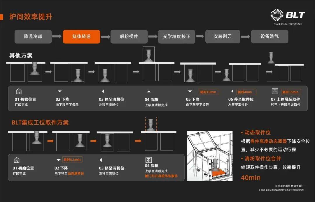 该方案特别针对大尺寸零件批量生产场景,围绕出光效率、成形效率、炉间效率环节展开,并适用于铂力特全系列3D打印设备;通过技术突破和流程优化,显著降低生产周期和成本,实现从"单点最优"到"全局最优"的转变。