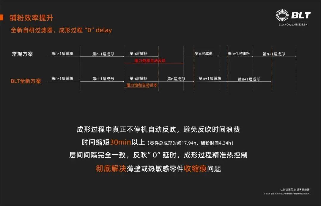 在铺粉效率方面,铂力特推出了单刀双向铺粉技术,能够有效避免空回程,单层铺粉总时间缩短可达31.5%,从源头减少了无效的行程耗时;设备还搭载了力传感器,能实时监测铺粉阻力,自适应修正铺粉速度。铺粉行程中,常规区域可提速至250mm/s,小角度成形区域(高度290-305mm)检测到刮刀剐蹭风险时,可智能降速至100mm/s,避免缺粉、掉粉缺陷。整体铺粉效率提升了72.1%,并且能够保障全区域铺粉质量的一致性。