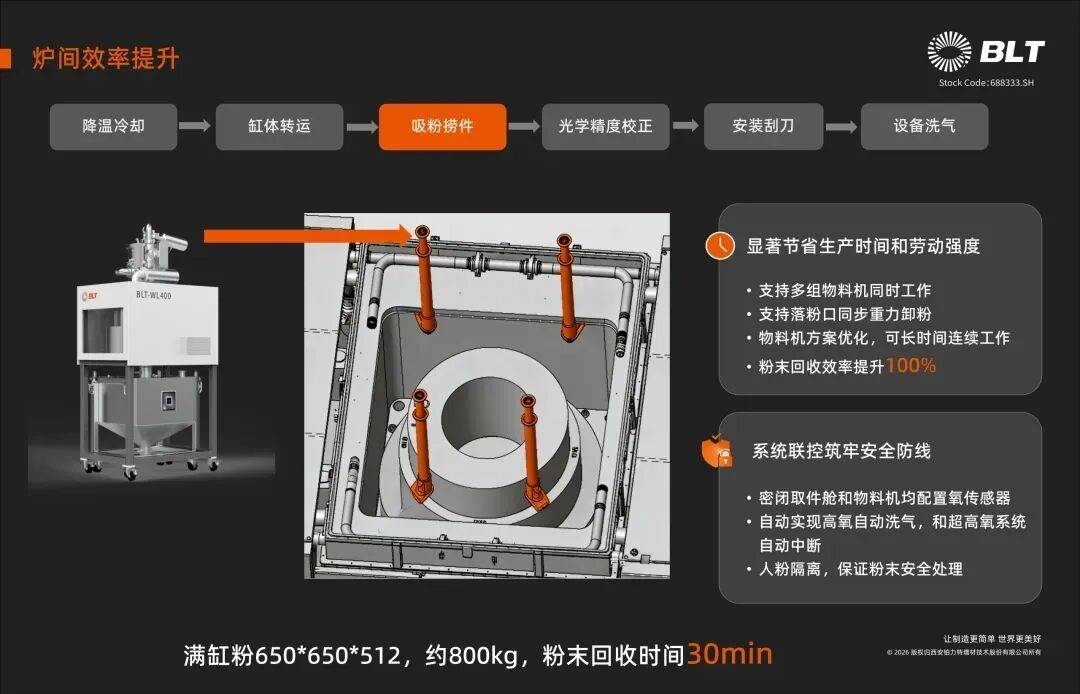 吸粉捞件环节支持多组物料机同时工作,支持落粉口同步重力卸粉,粉末回收效率提升100%;设备通过多重安全兜底设计,有效管控粉末处理过程中的氧含量风险与操作隐患,保障粉末安全处理。