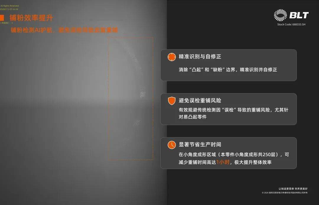 铂力特还推出了基于AI技术的铺粉检测技术。它基于超10万个缺陷样本和深度学习技术,持续优化模型。该技术能够智能识别缺粉、掉粉、凸起等细微异常,还引入了注意力机制,能够自主聚焦关键缺陷区域,在提升检出率的同时,可有效避免因误检导致的重铺延误。在小角度区域(共250层),可减少重铺时间高达1小时,极大减少了无效工时浪费。