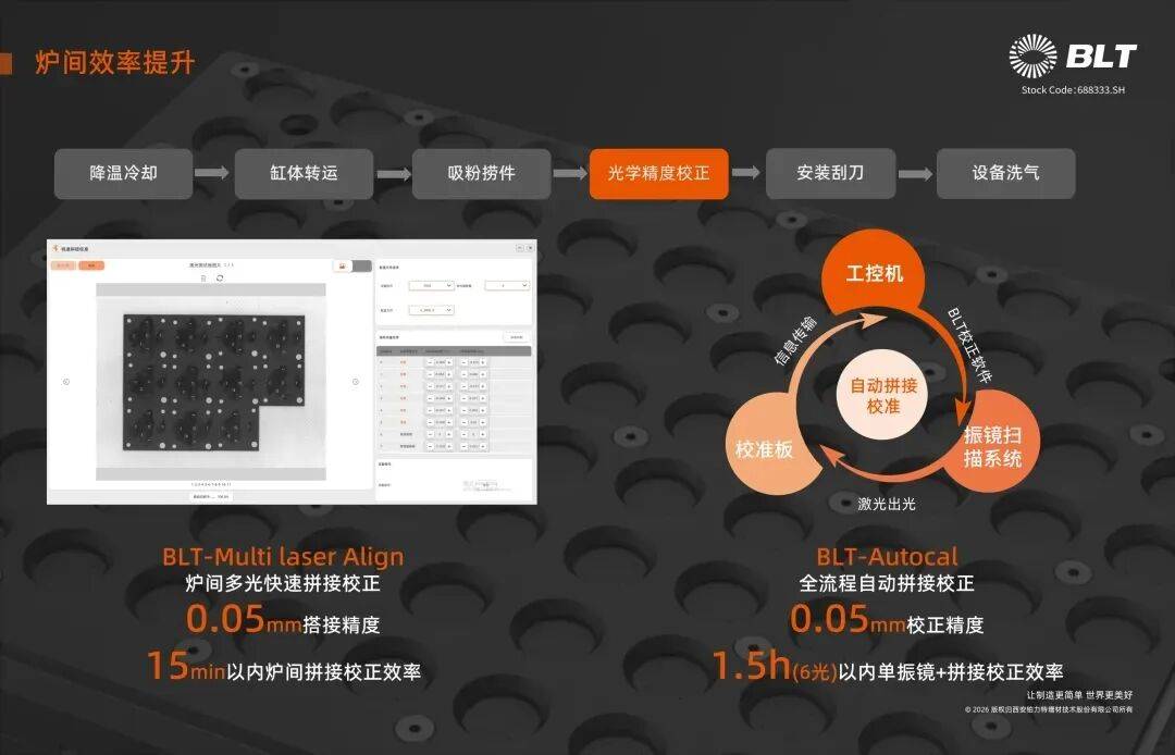 在多激光协同方面,通过优化搭接与任务分配,炉间激光束可实现0.05mm级拼接精度,15分钟内可完成多光拼接校正。设备搭载自研的BLT-AutoCAL全流程自动拼接方案,可实现高精度高效搭接校正,6光设备全流程校正用时约1.5小时,确保光学系统全时段高效利用。
