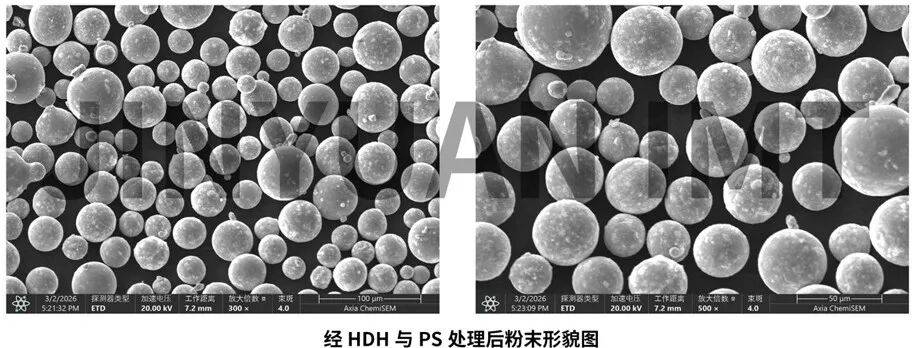 目前,该套装备已全面投产。成熟的工艺可将原本被视为废料的粗粉、客户3D打印后的报废粉、NG打印件、机加钛屑等全部回收,通过HDH破碎制粉+PS球形化处理,100%转化为高性能粉末,再生粉末在流动性、氧含量、球形度等关键指标上表现稳定,可无缝替代原生粉末,使其重新成为可用于3D打印和MIM注射成型的高性能钛合金粉末。