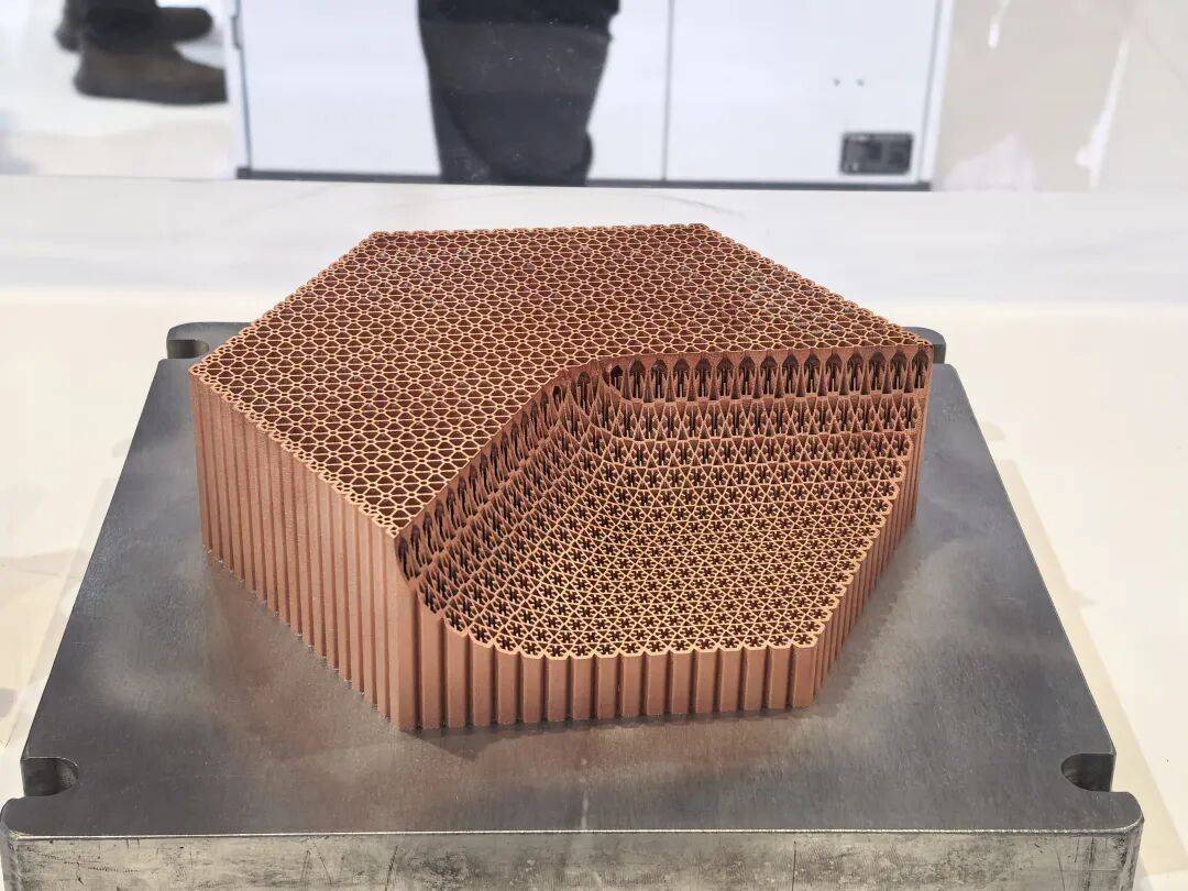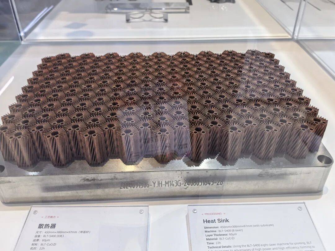 铂力特展示了由搭载绿光激光器的BLT-S310打印的纯铜散热器,部件尺寸为190mm×190mm×50mm,重量达3.14kg。