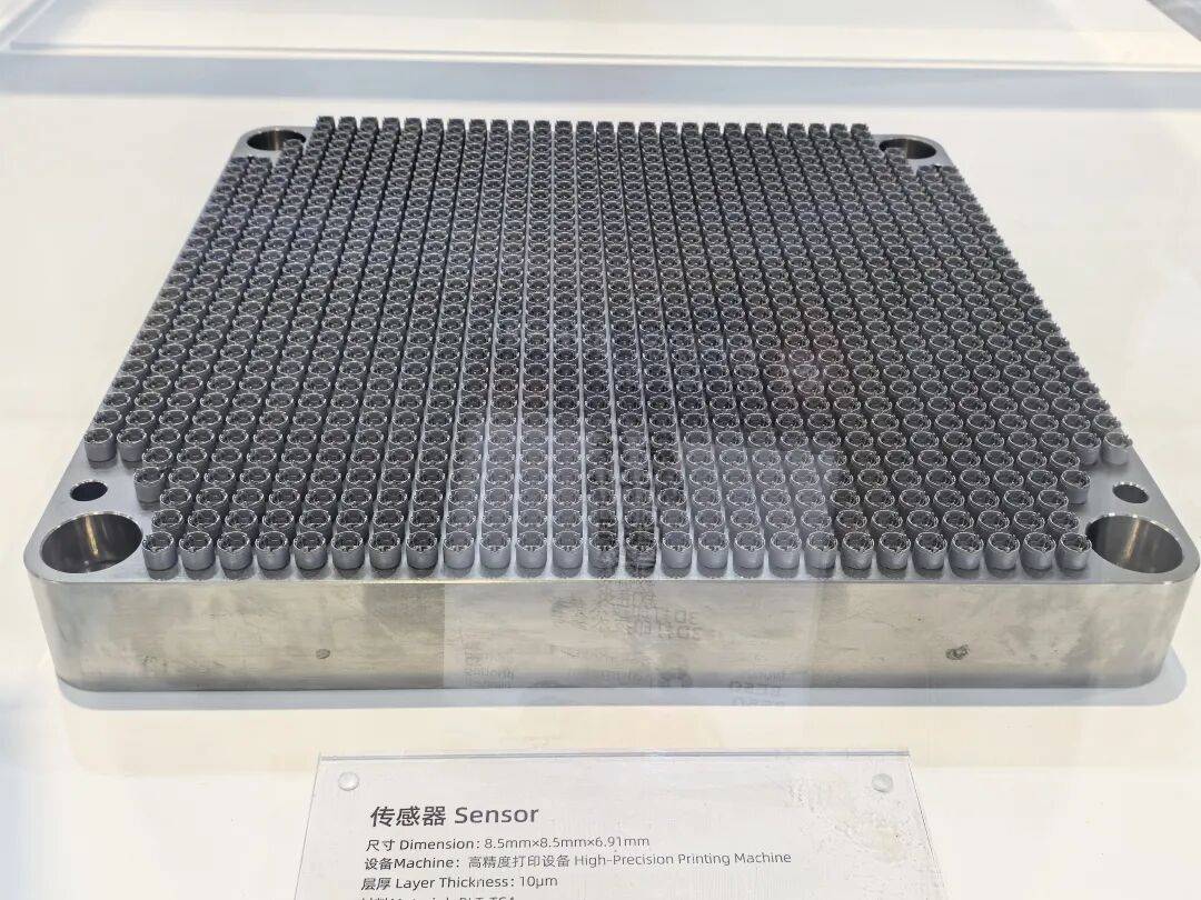 现场展示的一款高精度3D打印传感器的应用,具有特别意义。高精度3D打印的铺粉层厚能低至10μm,零件特征尺寸可低至0.05mm,零件打印完成之后的表面粗糙度可直接达到Ra2-3μm。