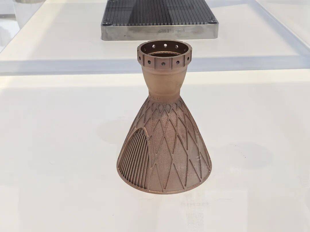 所展示的CuCrNb铜合金打印的喷管,使用40μm层厚,打印时间为20h。产品内置冷却复杂流道,可增加换热面积,确保流体在流道内的均匀快速流动,避免局部过热。铂力特自主研发的BLT-CuCrNb铜合金,实现了高导、高强、耐高温的多项突破,室温抗拉强度800MPa,延伸率10%,热导率245W/(m·K);500°C高温抗拉强度400MPa,延伸率10%。500°C高温热导率295W/(m-K)。
