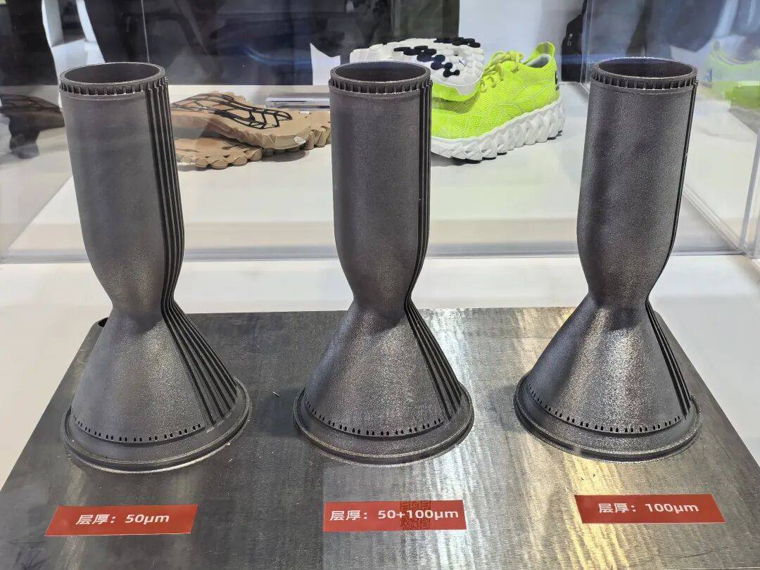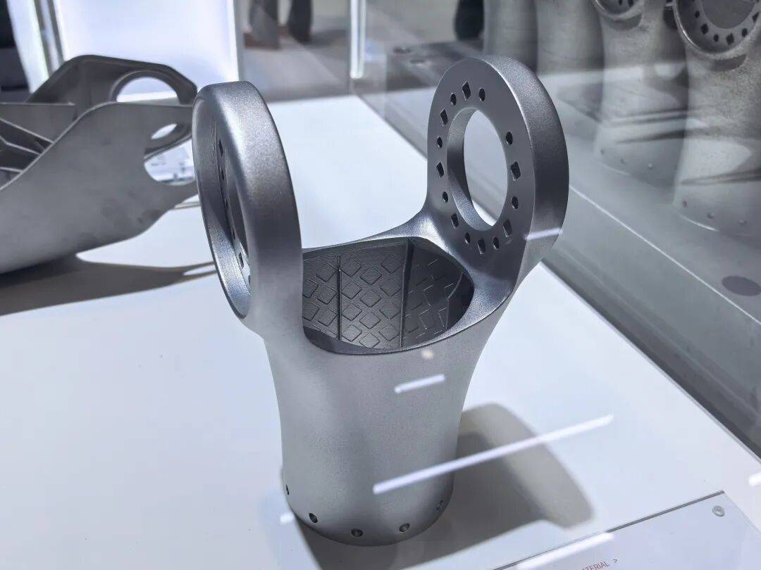 铂力特还展示了搭载20台激光器的S800设备,其核心应用场景是人形机器人产品的打印。现场展示的产品为人形机器人的手臂零部件,采用120μm层厚、高功率大光斑打印,能够有效地提升打印效率,降低打印零件的成本,从而适应人形机器人领域对大批量、低成本的制造要求。