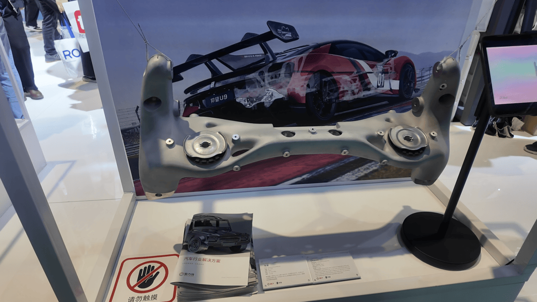 铂力特与比亚迪合作开发了U9X的车架产品。该车前后车架整体使用了12件3D打印产品,而且都采用了点阵+蒙皮的结构,使得整部汽车减重超过100公斤。帮助仰望U9X跑出了496.22km/h的成绩,取代燃油车登顶全球汽车极速榜首。这是汽车工业和3D打印技术结合,从而达到了世界级高度。