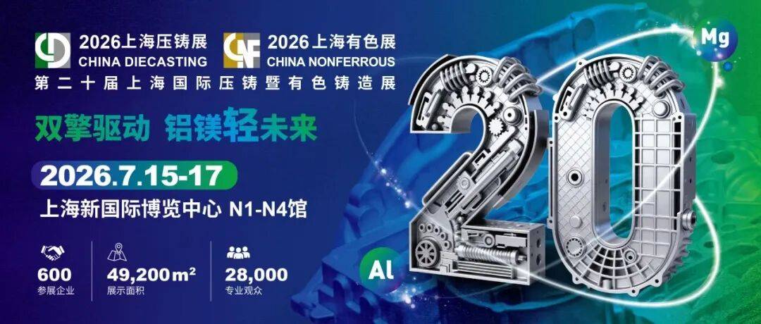 第二十届上海国际压铸暨有色铸造展(CHINA DIECASTING & CHINA NONFERROUS) 将于2026年7月15–17日在上海新国际博览中心(N1–N4馆)举办。预计展出面积49,200平方米,600+参展商,28,000+国内外专业观众。