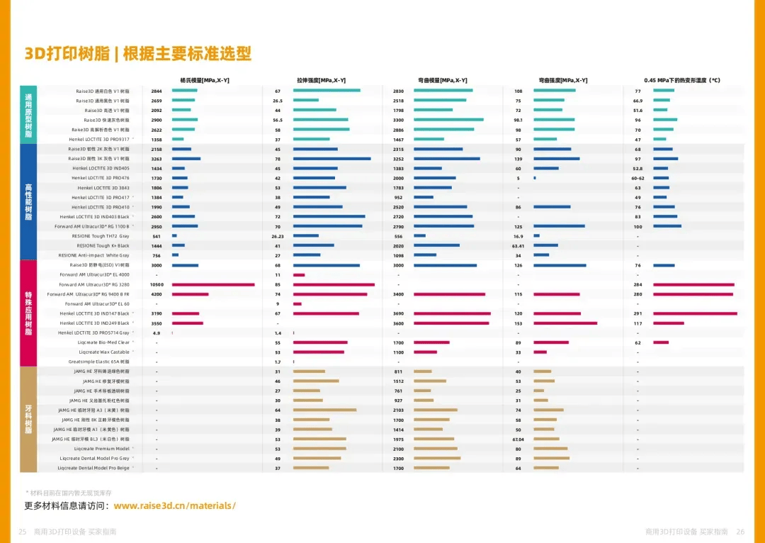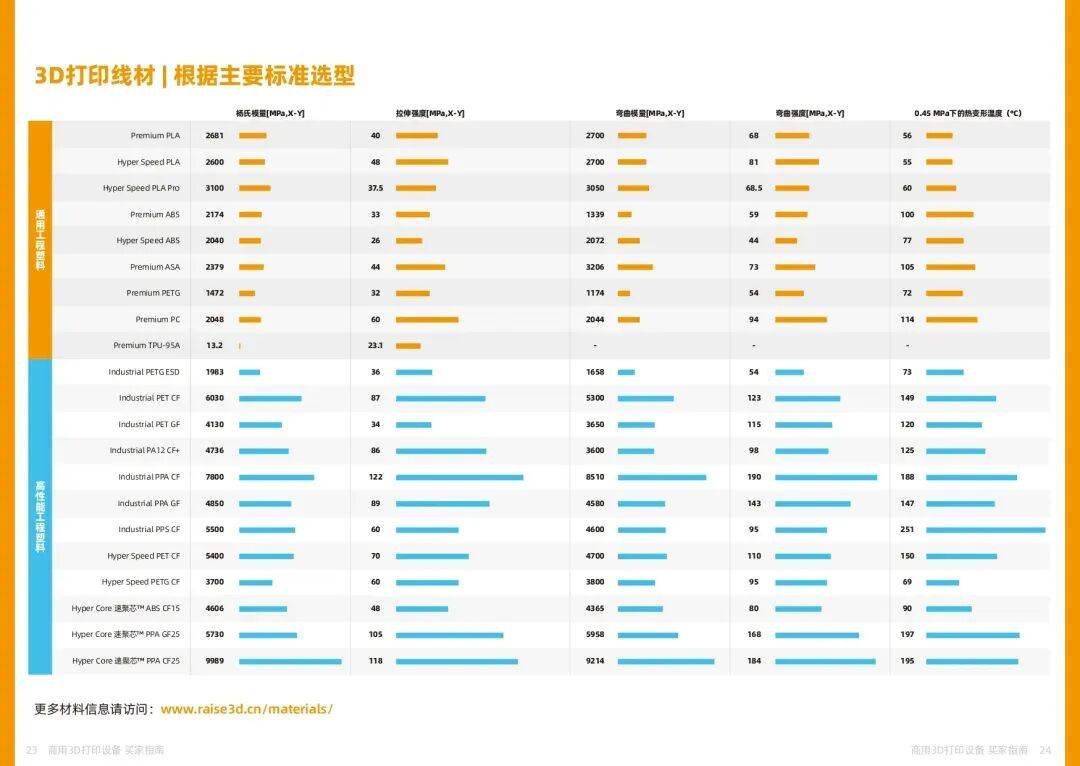 这份指南,就提供了覆盖绝大多数3D打印材料的选型标准,包括拉伸强度、热变形温度、硬度等实测数据,解决“材料选不对,零件性能不达标”的痛点。