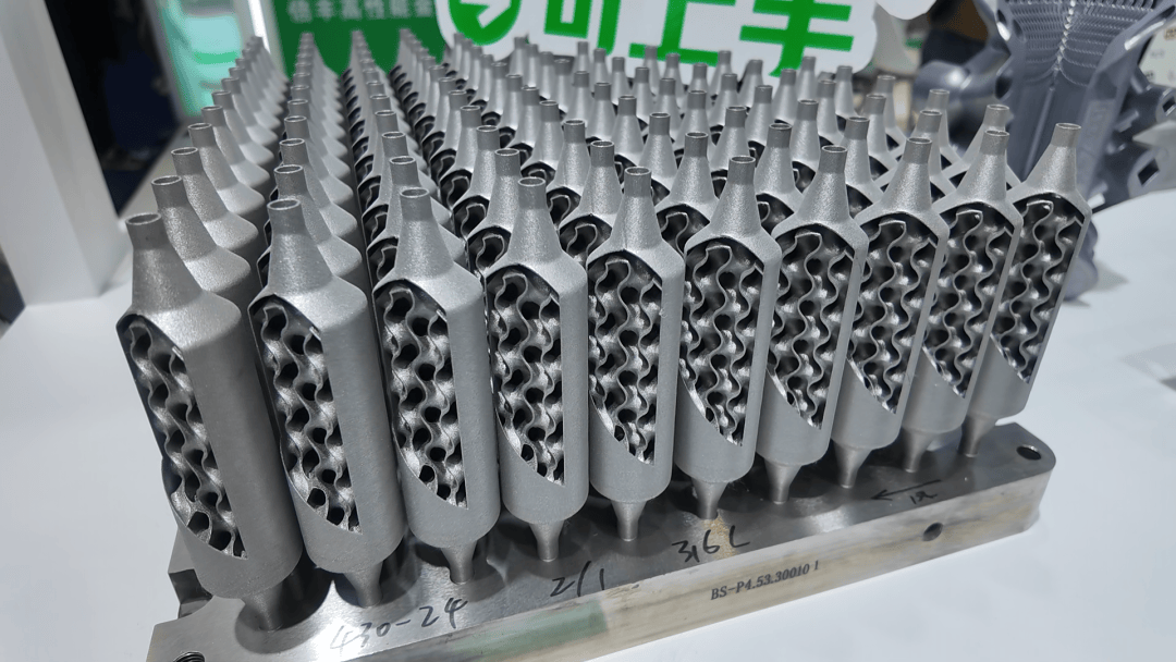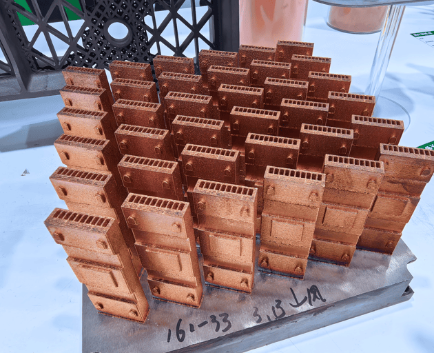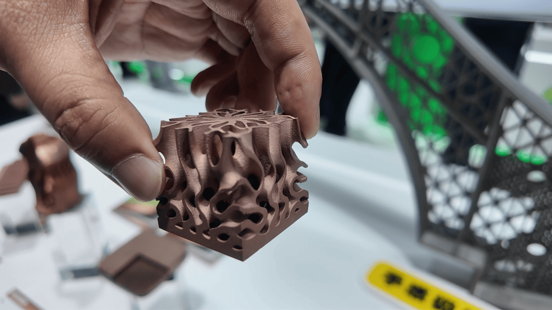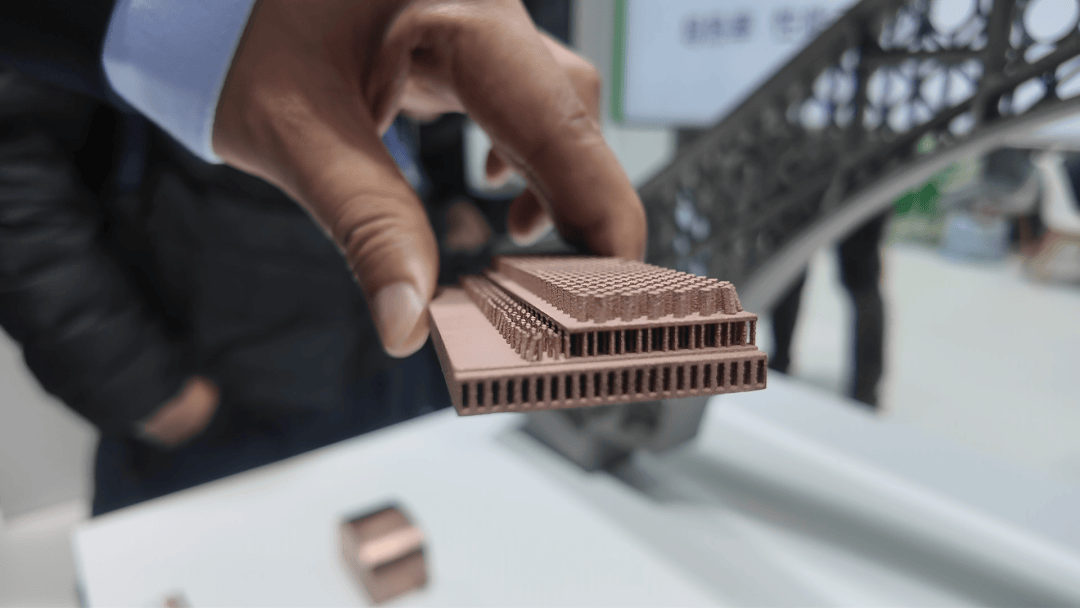 所展示的一款3D打印纯铜光模块,打破了传统机加工对复杂内部结构的限制,内部集成高效微通道设计,为高功率光模块提供更为高效的散热方案。倍丰指出,该产品在大幅降低芯片工作温度的同时,实现了一体化、轻量化减重,它不仅在物理层面上解决了800G及1.6T高速通信带来的热瓶颈挑战,更通过增材制造的几何自由度,给换热效率与结构强度带来了极大变化。