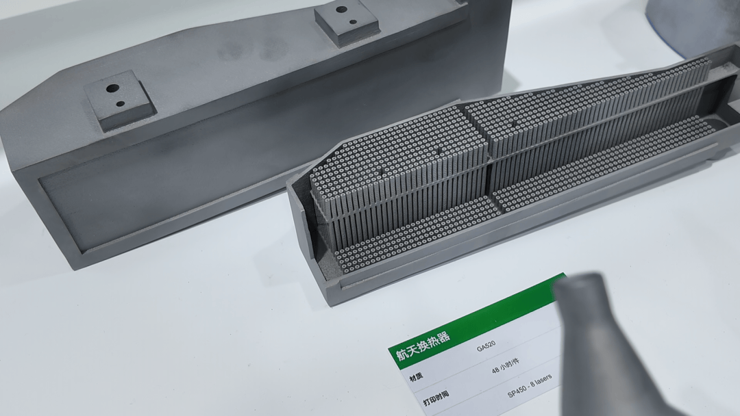 由316L不锈钢打印的具有蜂窝网状内流道的满版散热器,一次可制造出120个。该版散热器采用8激光SP430打印机制造,总时间80小时,相当于40分钟可打印一件产品。