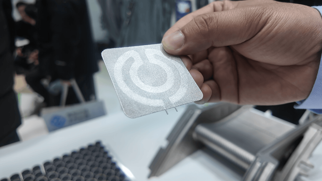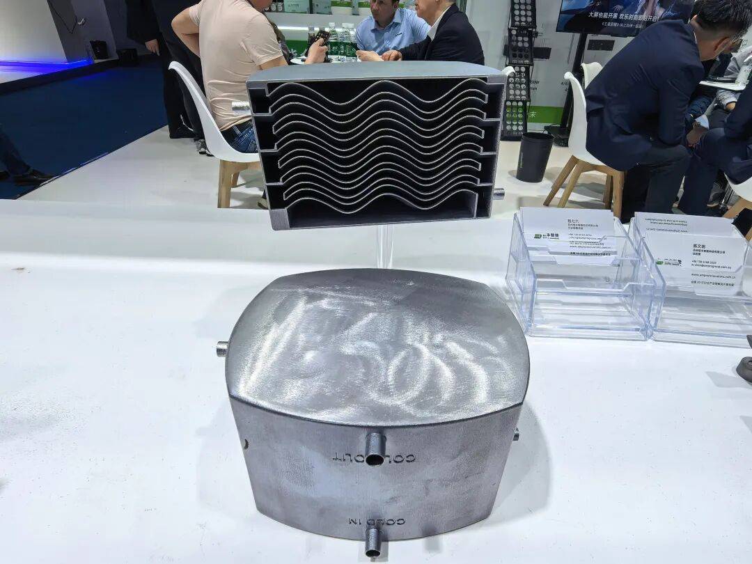 该0.3mm超薄散热器,虽在此前已经展出,但仍具有代表意义。其整体厚度仅为0.3mm,内含0.15mm冷却水路,采用GA520铝合金3D打印。通过结合3D打印优势,可在设计之初实现内部散热流道的拓扑优化,以实现更强的散热能力,有效解决消费电子、先进算力、高端芯片等行业的散热难题。