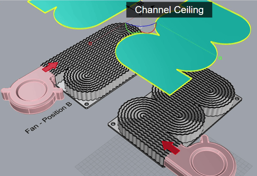 在查看了客户产品的3D模型后,他发现因为冷却风扇和发热元件之间的位置比较特殊,市面上能买到的普通散热器,没办法在这个特定位置下让空气顺畅流过鳍片表面,从而带走足够多的热量。