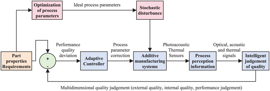 众多使用原位监控+机器学习提升增材制造工艺的稳定性和一致性以及成型零件质量的案例,可用下图描述增材制造中的智能闭环控制系统架构。